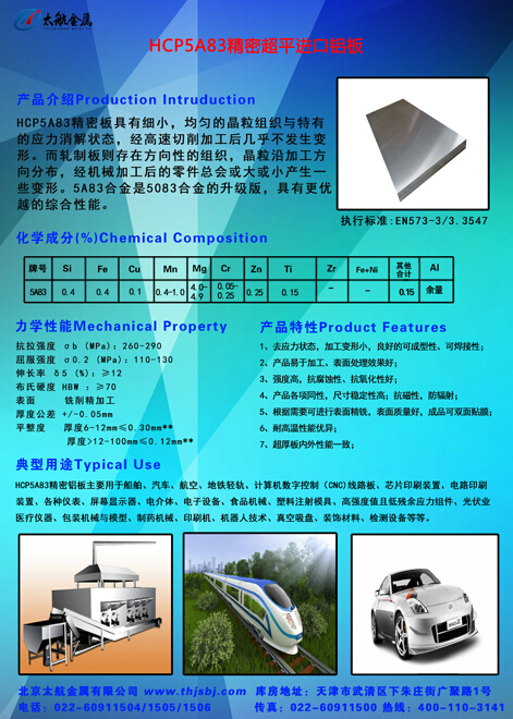 HCP5A83精密鋁板對雜質(zhì)、堿金屬元素和低熔點元素的嚴(yán)格控制提高了合金的耐蝕性和抗蠕變能力,板材兩面經(jīng)過銑磨加工呈現(xiàn)出超平精細表面,尺寸公差標(biāo)準(zhǔn)全球領(lǐng)先,出廠全檢,可雙面貼膜保護,強度超過歐洲同類產(chǎn)品,厚度規(guī)格覆蓋率高(≥4.5mm)。